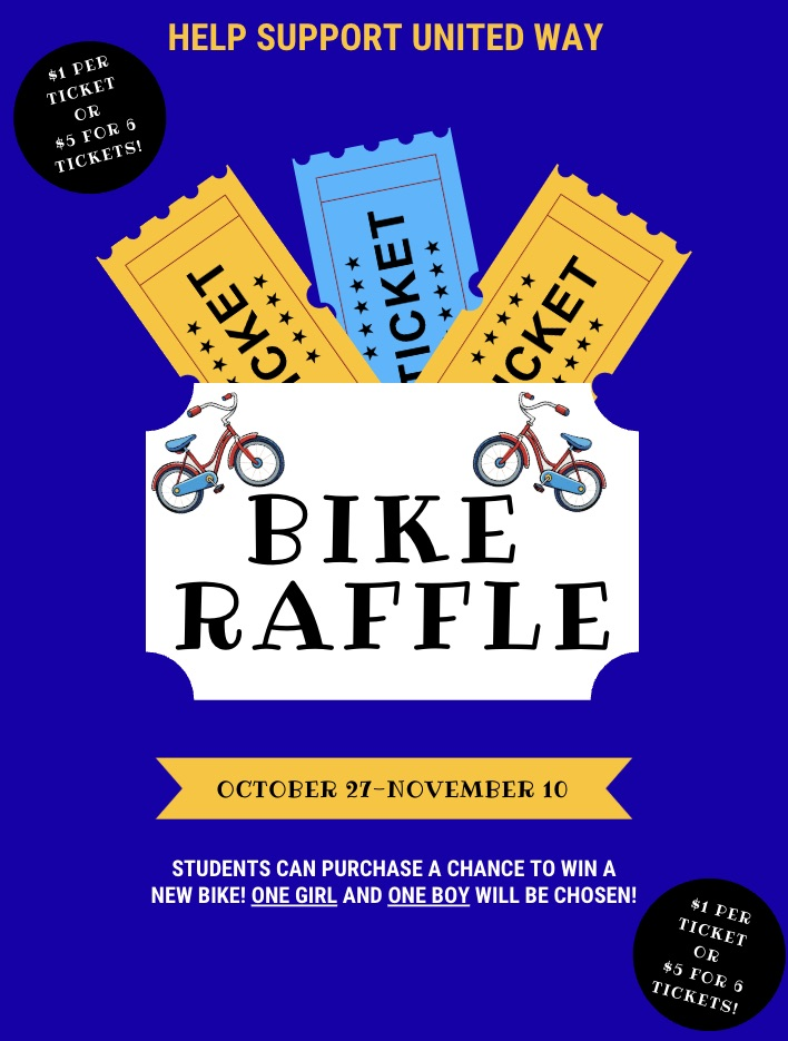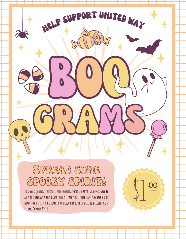 Our United Way Campaign has started! You can send in $1 or more with your child to purchase raffle tickets for the chance to win a brand new bike! Students can also purchase Boo-Grams to send to a friend at Black Hawk on Halloween for $1!